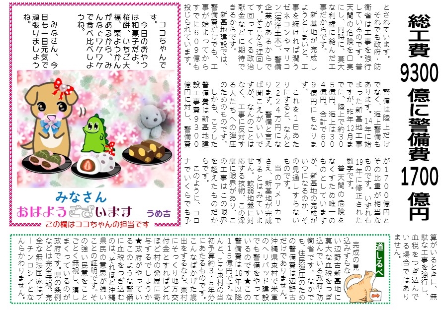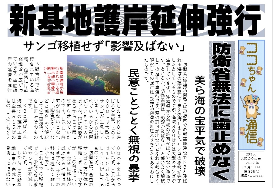新基地護岸延伸強行 投稿者:大阪のうめ吉2022年3月30日2022年3月30日カテゴリー:未分類タグ:サンゴ移植、美ら海、護岸延伸強行、軟弱地盤、辺野古新基地、note大阪のうめ吉、大阪のうめ吉 ココちゃん ザウルスちゃん ココちゃん通信、完成見込み無し、弾圧警備、普天間、沖縄県、沖縄防衛局 2022年3月30日 第266号 共有: X で共有 (新しいウィンドウで開きます) X Facebook で共有 (新しいウィンドウで開きます) Facebook いいね 読み込み中… 関連