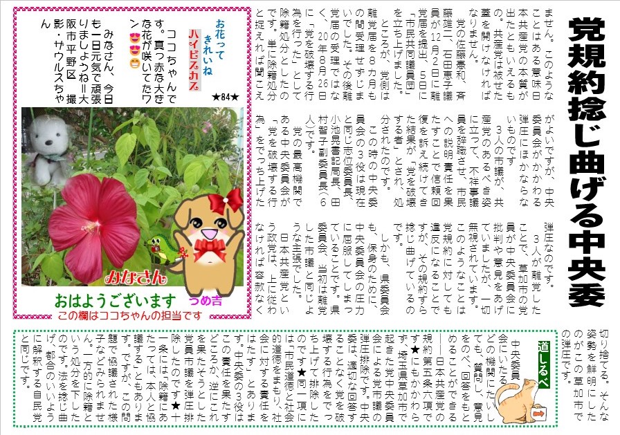 道しるべ 中央委員会にいたるどの機関にたいしても、質問し、意見をのべ、回答をもとめることができる――日本共産党の規約第五条六項です★にもかかわらず、埼玉県草加市で起きた党中央委員会による党市議の弾圧排除です。中央委は、適切な回答することなく党を破壊する行為をでっち上げて排除したのです★同一項には「市民道徳と社会的道徳をまもり、社会に対する責任をはたす」とあります。中央委の3役はこの責任を果たすどころか、逆にこれを果たそうとした党員市議を弾圧排除したのです★十一条には「除籍にあたっては、本人と協議する」ともあります。ですが、この問題で協議された様子などみられません。一方的に除籍という処分を下したのです。法を捻じ曲げ、都合のいいように解釈する自民党と同じです。