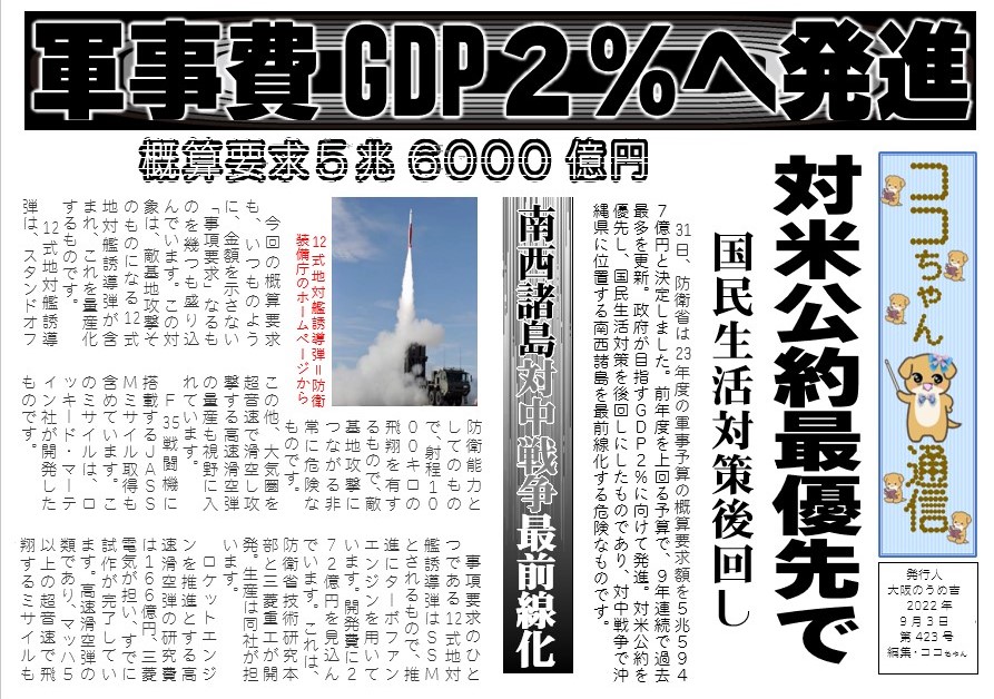 31日、防衛省は23年度の軍事予算の概算要求額を5兆5947億円と決定しました。前年度を上回る予算で、9年連続で過去最多を更新。政府が目指すGDP2%に向けて発進。対米公約を優先し、国民生活対策を後回しにしたものであり、対中戦争で沖縄県に位置する南西諸島を最前線化する危険なものです。