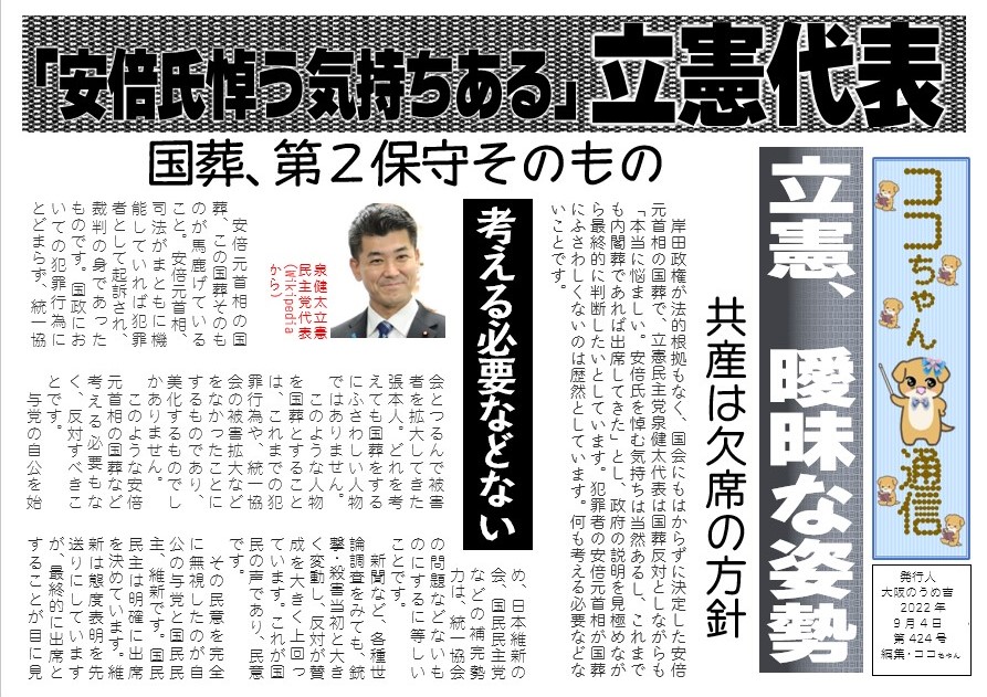 立憲の泉代表は、国葬を欠席するとすれば、共産と同じとみられることを警戒しているのでしようが、正しい選択をして、共産と同じとみられることを嫌っているなど全く馬鹿げています。こんな論理でいけば、共産と歩調を同じにすることが全てダメということになってしまいます。