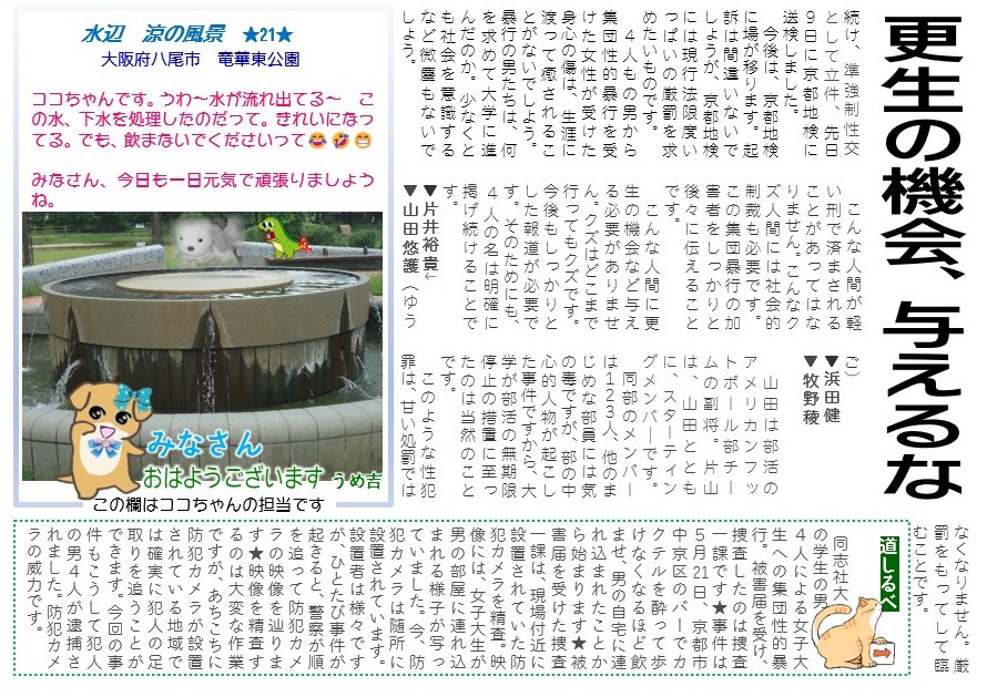 4人もの男から集団性的暴行を受けた女性が受けた身心の傷は、生涯に渡って癒されることがないでしよう。暴行の男たちは、何を求めて大学に進んだのか。少なくとも社会を意識するなど微塵もないでしょう。続け、準強制性交として立件、先日9日に京都地検に送検しました。