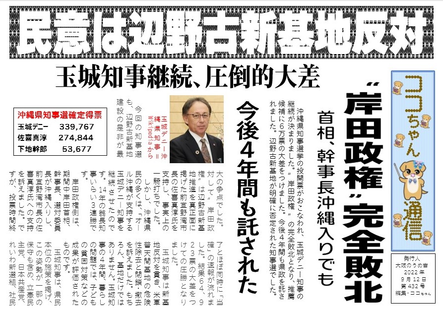 沖縄県知事選挙の投開票がおこなわれ、玉城デニー知事の継続が決まりました。”岸田政権 ”の完全敗北となり、推薦候補に6万票の大差をつけました。今後4年間も県政を託されました。辺野古新基地が明確に否定された知事選でした。