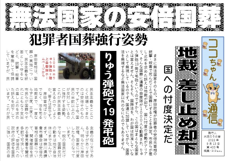 まさに無法国家そのもの。岸田政権が犯罪者の安倍元首相の銃撃・殺害で死んだことで国葬にすることを決定。市民らが差し止めを求めた訴えは地裁が却下。国に忖度の姿勢がアリアリ。そんな国葬に違憲の自衛隊が1000人も動員され、りゅう弾砲19発で弔砲というのですから、この国はまともな国家とは言えません。そもそも、国際法を、わが国は批准していないとして無視しているのです。国連に加盟していながら、国際法を無視するなど無法国家以外のなにものでもありません。