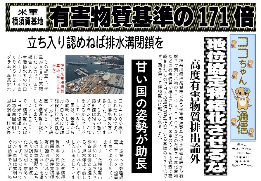 道しるべ 米軍横須賀基地、排水溝で、基準の171倍のPFOS、PFOAなどの有機フッ素化合物などの有害物質が検出されました。★人が接種すれば、ガンになったり成長を阻害したりします。基準の171倍など完全に論外★このような汚染水が灌漑用水に流れ込み、冠水として畑に使われたりすると、作物が有害物質を吸収します。水道水を取水する水に流れた場合飲料水によって接種することになります★このような物質を含んだ汚染水を下水に流すなど許されることでありません。日本の法律が適用されないのならば、米国の法令を適用させるような対応を国がすべきです。それすらできないのであれば、国は米に日航機事件での弱みを握られているからでないのか。