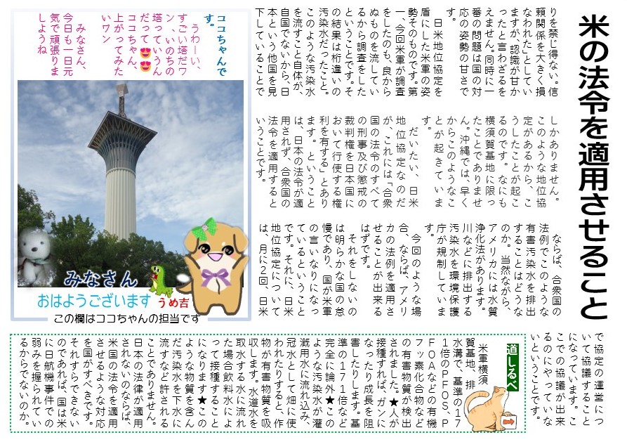 それをしないのは明らかな国の怠慢であり、国が米軍の言いなりになっているということです。それに、日米地位協定については、月に2回、日米で協定の運営について協議することになっています。ここでの協議が出来るのにやっていないということです。