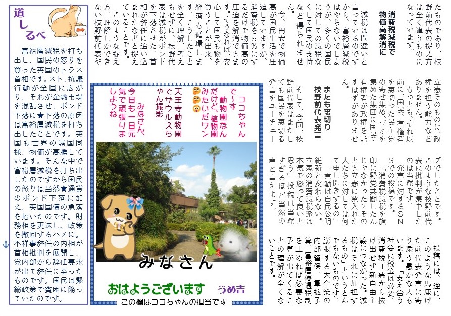 今、円安で物価高が国民生活を圧迫していますが、消費税を5%にするだけで物価高の圧迫を解消できます。そうなれば、安心して国民も物を買うことが出来、経済も循環します。こうしたことを全く理解、考えもせずに、枝野代表は減税がポンドを下落させた、首相が辞任に追い込まれたなどと捉えていることです。