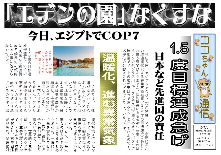 今日6日、エジプトでCOP27が開幕します。急速に進む地球温暖化による異常気象被害。1・5度の目標達成にあれこれ言う時間はありません。旧約聖書にあるエデンの園、それはイラクのチグリス川、ユーフラテス川下流にあるメソポタミア湿地帯です。その地が干ばつで消えようしとしているのです。温暖化の影響はこれほどまでに及んでいるのです。