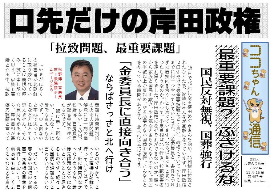 15日で45年になる横田めぐみさんを始め、北朝鮮に拉致されたひとたち。家族はみんなが高齢になっています。岸田政権は口先だけで最重要課題などと言い、政権についてからこれまでに何一つやってきていません。「金委員長と、条件をつけずに直接向き合う」とも言っています。ならばさっさと北へ行ったらどうなのか。かつて、小泉首相は北へ行き、拉致被害者を連れ帰りました。岸田政権になぜそれができないのか。頭っから家族と国民を欺き、やる気などさらさらないのです。国民の半数以上が反対の、やる必要のない国葬を強行。こんなことをやっている時間があるなら、北へ行けたはずです。