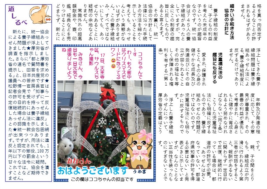 新たに、統一協会による養子縁組あっせん問題が浮上してきました★厚労省が調査を指示しました。さらに「都と厚労省の連名で質問書を提示し、回答を求める」と、日本共産党の議員への答弁です★松野博一官房長官は記者会見で「知事らの 許可を受けずに一定の目的を持って反復継続的にあっせんした場合は養子縁組あっせん法に違反」との認識を示しました★統一教会包囲網が出来つつあります。ですが、同法に違反と認定されても、1年以下の懲役、100万円以下の罰金という甘々な法令に疑問。これでは、協会を潰すことなど期待できません。