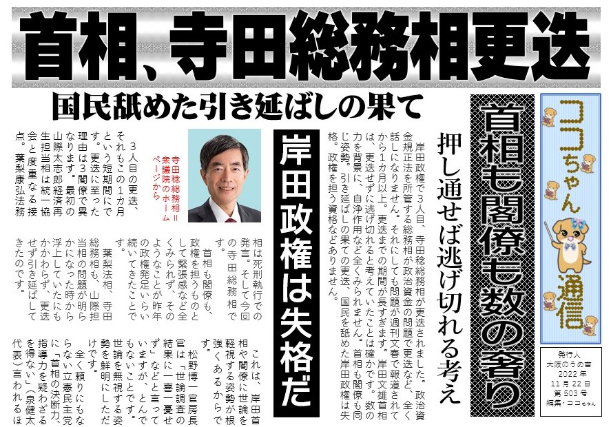 岸田政権で3人目、寺田稔総務相が更迭されました。政治資金規正法を所管する総務相が政治資金の問題で更迭など、全く話しになりません。それにしても問題が週刊文春で報道されてから1カ月以上。更迭までの期間が長すぎます。岸田文雄首相は、更迭せずに逃げ切れると考えていたことは確かです。数の力を背景に、自浄作用など全くみられません。首相も閣僚も同じ姿勢。引き延ばしの果ての更迭、国民を舐めた岸田政権は失格。政権を担う資格などありません。