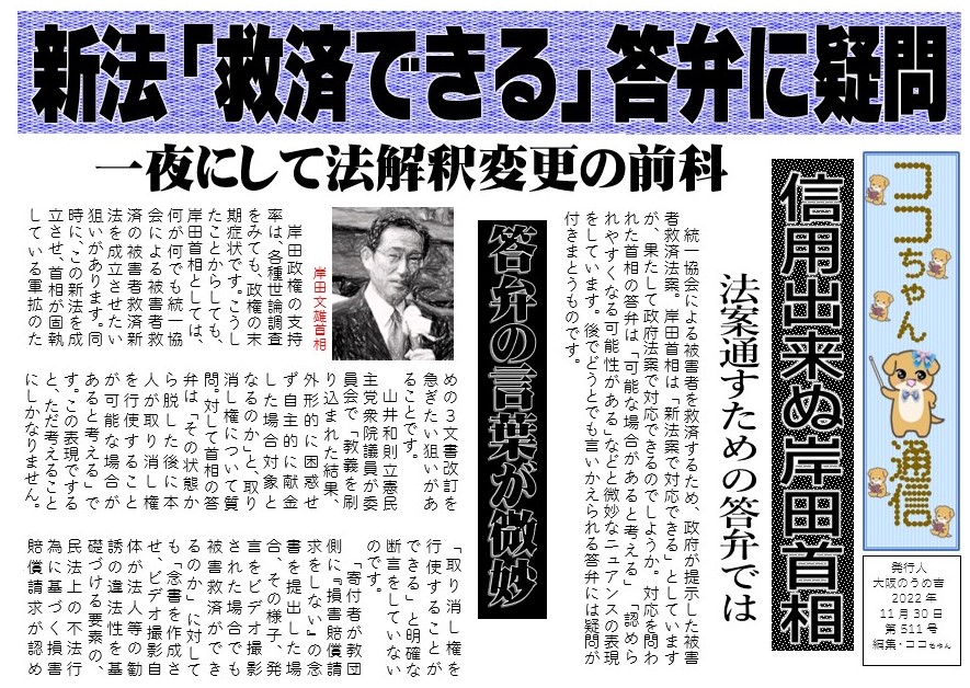 統一協会による被害者を救済するため、政府が提示した被害者救済法案。岸田首相は「新法案で対応できる」としていますが、果たして政府法案で対応できるのでしようか。対応を問われた首相の答弁は「可能な場合があると考える」「認められやすくなる可能性がある」などと微妙なニュアンスの表現をしています。後でどうとでも言いかえられる答弁には疑問が付きまとうものです。いうことです。