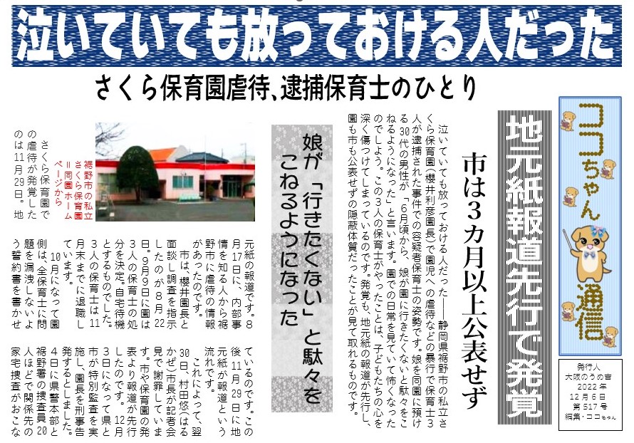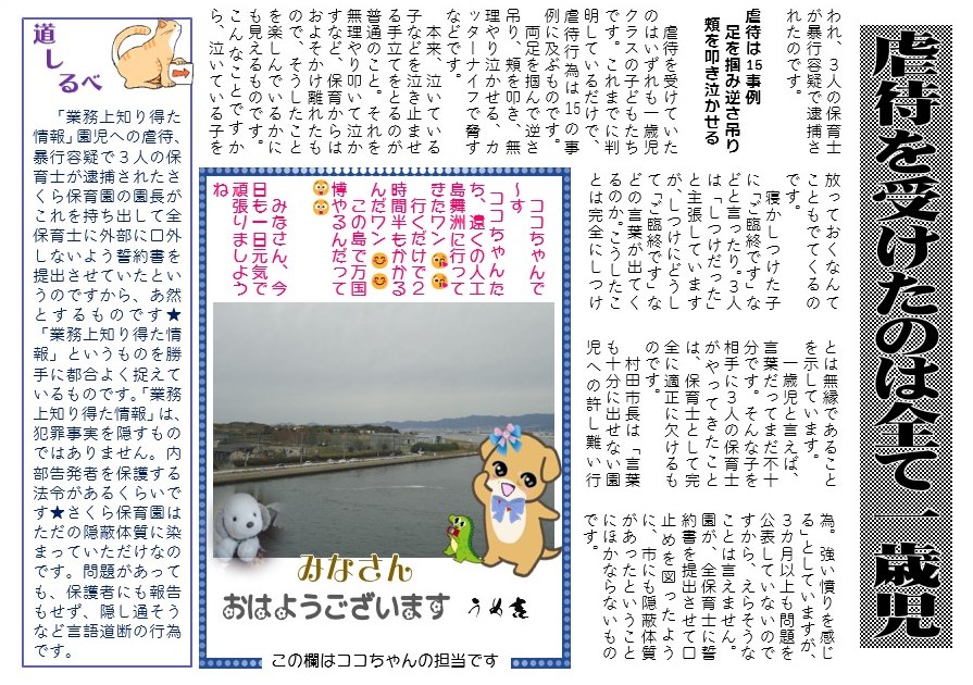 村田市長は「言葉も十分に出せない園児への許し難い行為。強い憤りを感じる」としていますが、3カ月以上も問題を公表していないのですから、えらそうなことは言えません。園が、全保育士に誓約書を提出させて口止めを図ったように、市にも隠蔽体質があったということにほかならないものです。
