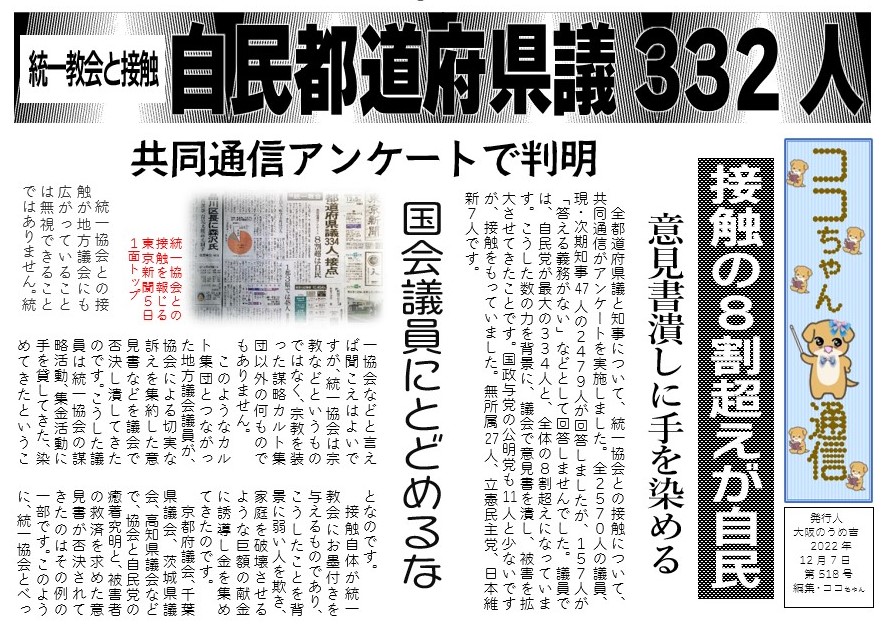 全都道府県議と知事について、統一協会との接触について、共同通信がアンケートを実施しました。全2570人の議員、現・次期知事47人の2479人が回答しましたが、157人が「答える義務がない」などとして回答しませんでした。議員では、自民党が最大の334人と、全体の8割超えになっています。こうした数の力を背景に、議会で意見書を潰し、被害を拡大させてきたことです。国政与党の公明党も11人と少ないですが、接触をもっていました。無所属27人、立憲民主党、日本維新7人です。