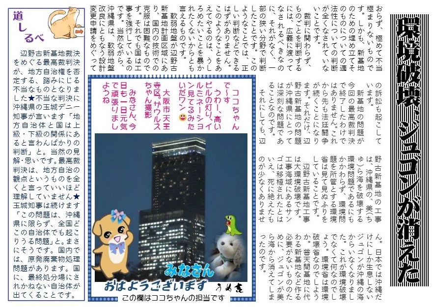 辺野古新基地裁決をめぐる最高裁判決が、地方自治権を否定する、踏みにじる不当なものとなりました★不当な判決に沖縄県の玉城デニー知事が言います「地方自治体と国は上級・下級の関係にあると言わんばかりの判断」と。当然の見解・思いです。最高裁判決は、地方自治の観点というものを全くと言っていいほど理解していません★玉城知事は続けます「この問題は、沖縄県に限らず、全国どこの自治体でも起こりうる問題」と。まさにそうです。国内では、原発廃棄物処理問題があります。国に、最終処分場にされかねない自治体が出てくることです。