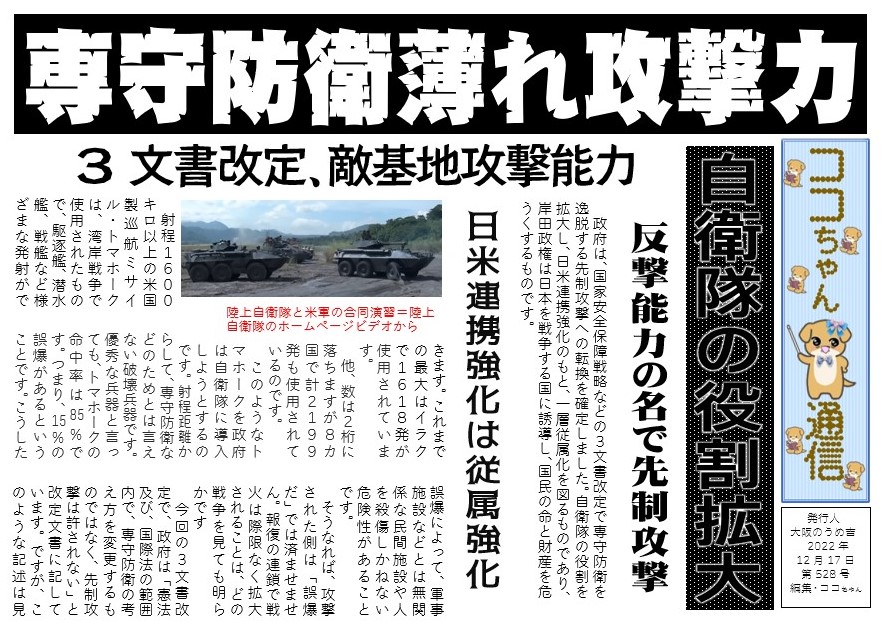 政府は、国家安全保障戦略などの3文書改定で専守防衛を逸脱する先制攻撃への転換を確定しました。自衛隊の役割を拡大し、日米連携強化のもと、一層従属化を図るものであり、岸田政権は日本を戦争する国に誘導し、国民の命と財産を危うくするものです。