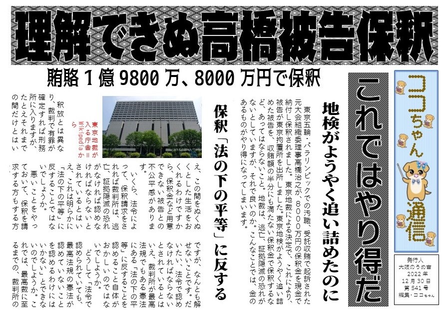 東京五輪・パラリンピックでの汚職、受託収賄で起訴された元大会組織委理事高橋治之が、8000万円の保釈金を現金で納付し保釈されました。東京地裁による決定で、これにより、被告が東京拘置所を出所しました。東京地検がようやく追い詰めた被告を、収賄額の半分にも満たない保釈金で保釈するなど、あってはならないこと。地裁は、逃亡、証拠隠滅の恐れがないとしていますが、それで良いのか。こんなことでは、金のあるものがやり得になってしまいます。