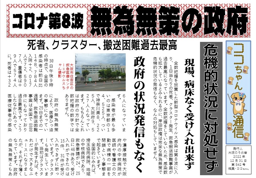 全数把握を放棄した新型コロナウイルス感染は第8波に入り、1日当たりの死者、クラスター発生、救急搬送困難事案が過去最高になっています。全数把握をしていないため、感染数も拡大しているとみられるのに、岸田政権は完全な無為無策で危機的状況になんの対処もしていません。