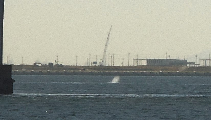 クジラさん、撮影中も同じ場所から全く動かないのですよね。それでも、時々潮を吹き上げていることが確認できました。河口は2mくらいの深さという報道ですが、淀川の真水が大量に流れ込む場所、そんな真水か海水かわからないようなところで大丈夫なのかなと心配です。