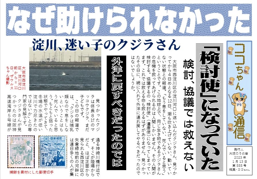ですが、その結果は心配されたことになりました。クジラさんを外洋に戻してあげたくても、たとえ有志が集まったとしても、民間ではどうにもできません。行政でなければ出来ないことだからです。その行政側となる大阪市が検討だの協議するのだのです。保護する気薄さがそうさせたのでしょう。