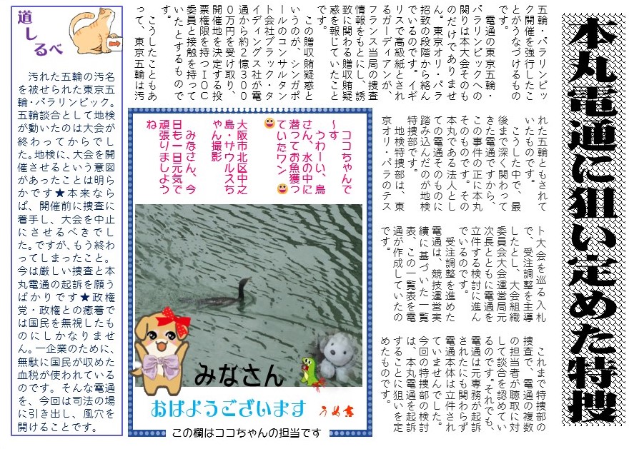 道しるべ 汚れた五輪の汚名を被せられた東京五輪・パラリンピック。五輪談合として地検が動いたのは大会が終わってからでした。地検に、大会を開催させるという意図があったことは明らかです★本来ならば、開催前に捜査に着手し、大会を中止にさせるべきでした。ですが、もう終わってしまったこと。今は厳しい捜査と本丸電通の起訴を願うばかりです★政権党・政権との癒着では国民を無視したものにしかなりません。一企業のために、無駄に国民が収めた血税が使われているのです。そんな電通を、今回は司法の場に引き出し、風穴を開けることです。