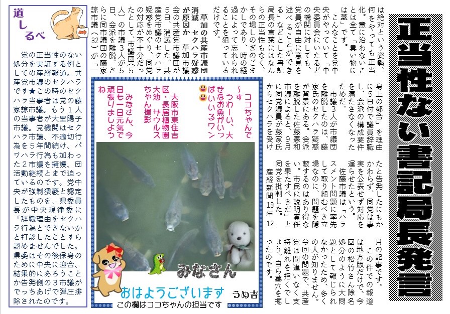 道しるべ 党の正当性のない処分を実証する例としての産経報道。共産党市議のセクハラです★この時のセクハラ当事者は党の藤家諒市議。もう1人の当事者が大里里子市議。党機関はセクハラ市議、不適切行為を5年間続け、パワハラ行為も加わった2市議を擁護、団活動継続とまで迫っているのです。党中央が強制猥褻と認定したものを、県委員長が中央規律委に「辞職理由をセクハラ行為とできないかと打診したことすら認めませんでした。県委はその後保身のために中央に迎合、結果的にあろうことか告発側の3市議がでっちあげで弾圧排除されたのです。