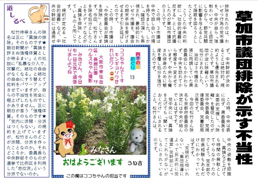 委員長は「党規約 と相いれない主張を公然と行い、異論を許さない政党だと攻撃」と松竹さんを批判し、あたかも党規約に沿った判断を装っています。これが党規約に沿ったもので正しいならば、党草加市議団を強権でもってして弾圧排除したことは重大な誤りを証明するようなものです。