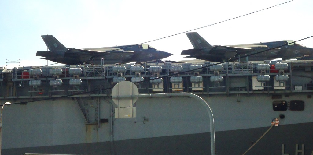 艦上にみられるのは、今回日米合同訓練に参加するために搭載されたF35Bステルス戦闘機です。レーダーに捕捉されにくいとされている戦闘機です😮😮