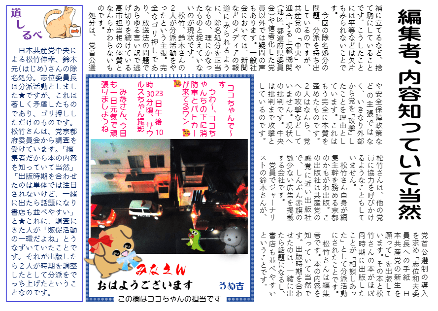 道しるべ 日本共産党中央による松竹伸幸、鈴木元(はじめ)さんの除名処分。志位委員長は分派活動としました★ですが、これは著しく矛盾したものであり、ゴリ押ししただけのものです。松竹さんは、党京都府委員会から調査を受けています。「編集者だから本の内容を知っていて当然」「出版時期を合わせたのは単体では注目されないけど、一緒に出たら話題になり書店も並べやすい」と★これに、調査にきた人が「販促活動の一環だよね」とうなずいていたことです。それが出版したら2人が時期を調整したとして分派をでっち上げたということなのです。