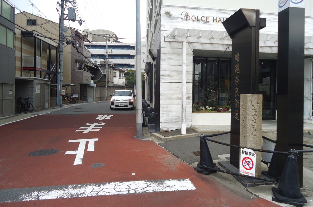 道路を挟んで前にはスーパーがあります、メイン道路に暗越奈良街道のモニュメント風の案内が道標と合体して堂々と建てられています😲😲😲