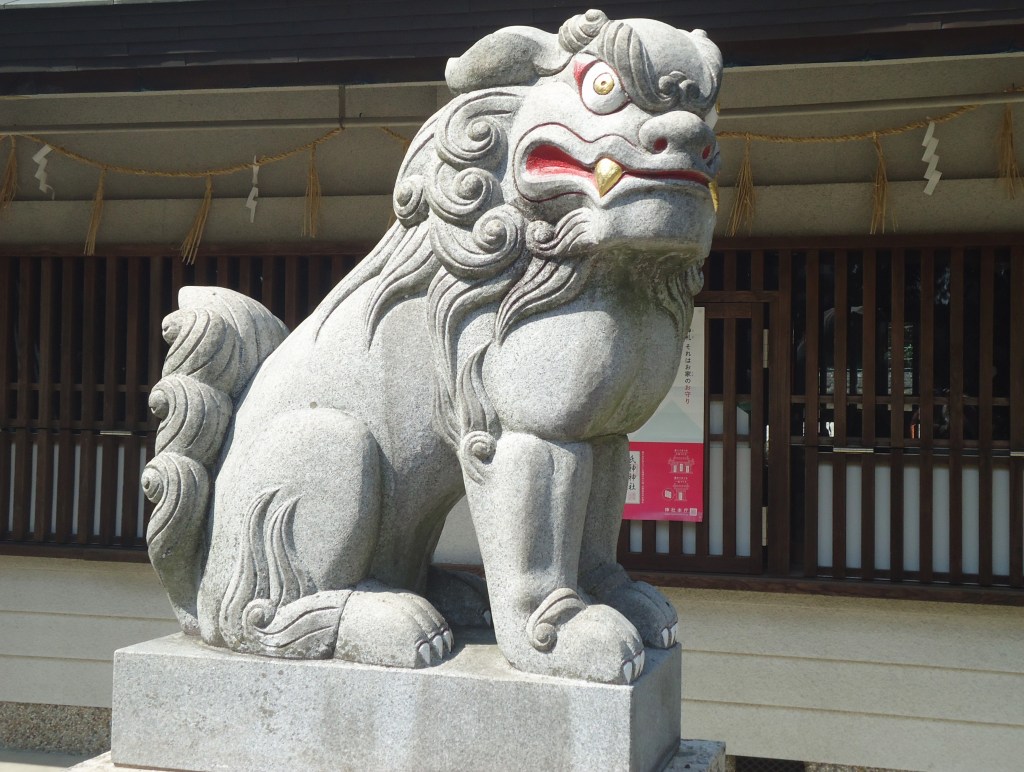 このコマさん、目は金色なんですよ。口は赤です。比較的新しいコマさんなんです。ちょっと高い古墳のようなところにある神社のコマさんなんですよね。なんか最近はコマさんが待っていてくれてるような気がしてます😁
