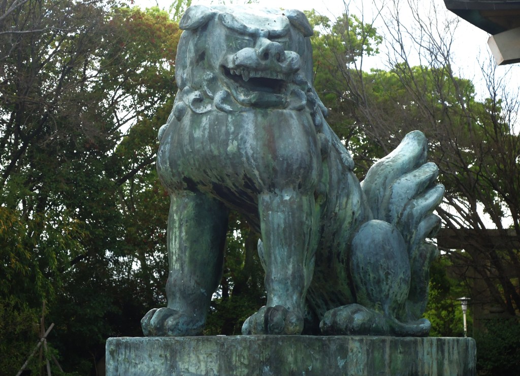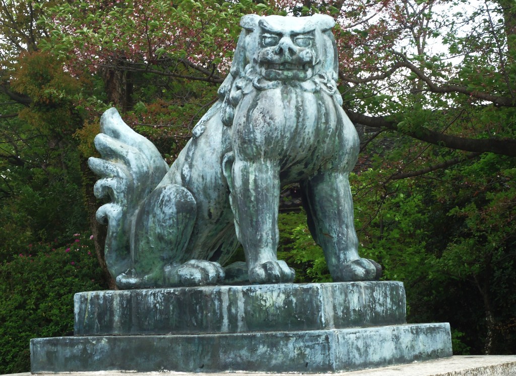 この、口を開けている阿形のコマさん、なんとなく話しかけてくれてるように感じられます。コマさんの近くに豊臣秀吉の像が建っているのですが、こちらは復元されたものなんです。戦中の「金属回収令」で像が拠出されたとのこと。鍋、釜まで拠出させられた時代ですから。そんな戦争やって勝ち目などあるはずないのですがね。