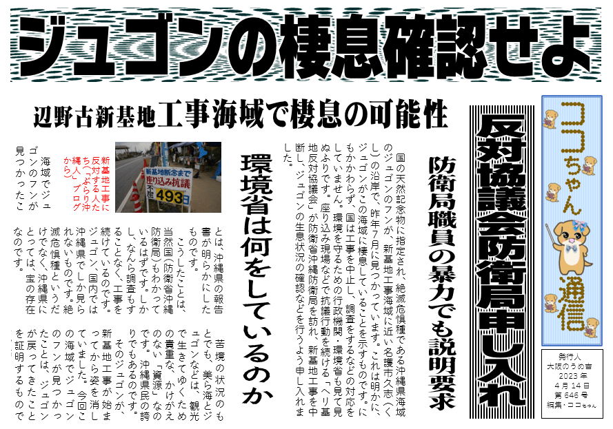国の天然記念物に指定され、絶滅危惧種である沖縄県海域のジュゴンのフンが、新基地工事海域に近い名護市久志(くし)の沿岸で、昨年7月に見つかっています。これは明かに、ジュゴンがこの海域に棲息していることを示すものです。にもかかわらず、国は工事を中止し、調査をするなどの対応をしていません。環境を守るための行政機関・環境省も見て見ぬふりです。座り込み現場などで抗議行動を続ける「ヘリ基地反対協議会」が防衛省沖縄防衛局を訪れ、新基地工事を中断し、ジュゴンの生息状況の確認などを行うよう申し入れました。
