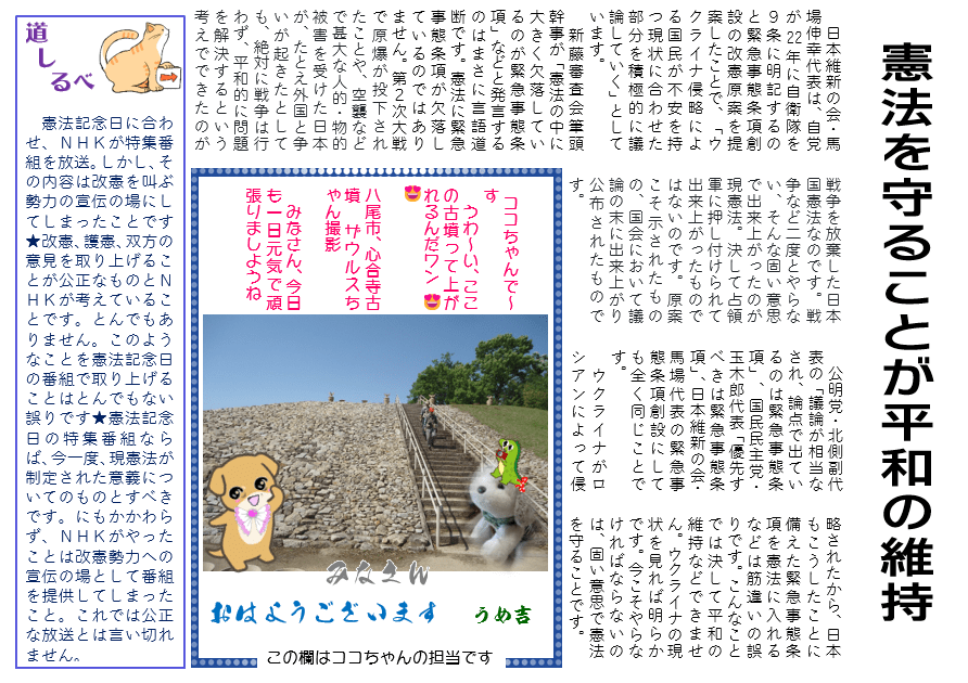 道しるべ   憲法記念日に合わせ、NHKが特集番組を放送。しかし、その内容は改憲を叫ぶ勢力の宣伝の場にしてしまったことです★改憲、護憲、双方の意見を取り上げることが公正なものとNHKが考えていることです。とんでもありません。このようなことを憲法記念日の番組で取り上げることはとんでもない誤りです★憲法記念日の特集番組ならば、今一度、現憲法が制定された意義についてのものとすべきです。にもかかわらず、NHKがやったことは改憲勢力への宣伝の場として番組を提供してしまったこと。これでは公正な放送とは言い切れません。