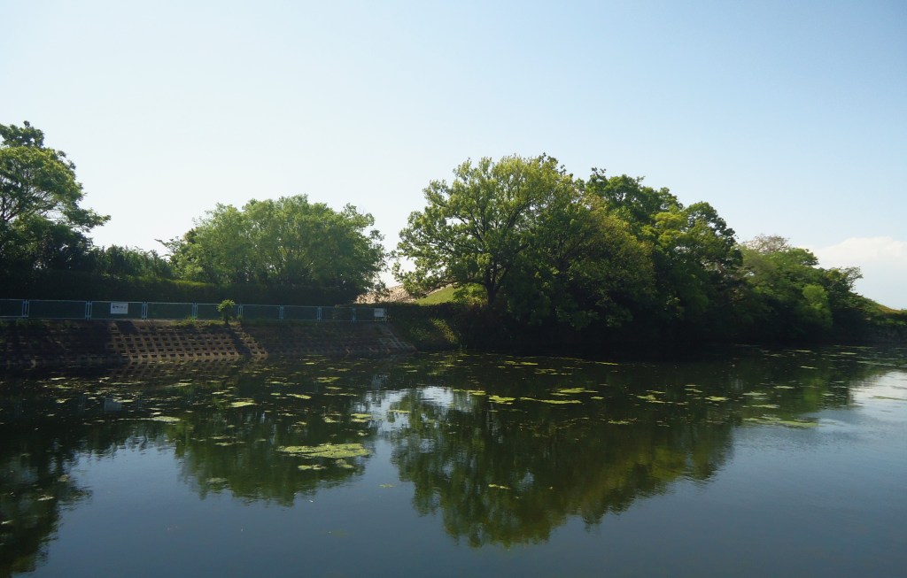 この古墳は生駒山地の麓に等高線に沿うように築かれているだけでなく、周濠が南側と北側の2か所を堤で造って区切られています。こうしたことから、東西で水位が異なるという珍しいつくりになっています😲