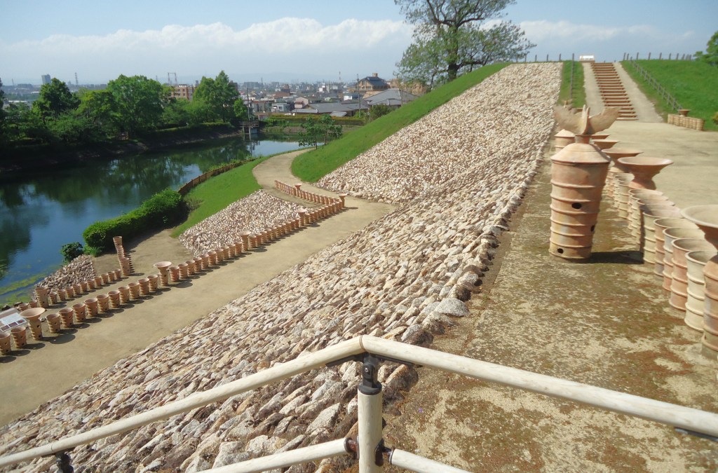 墳丘各段の平坦部に約3,000本の円筒埴輪が並べられ、並べ方に規則性があり、円筒埴輪、器財埴輪、形象埴輪を規則正しく組み合わせて並べられていたものです😀