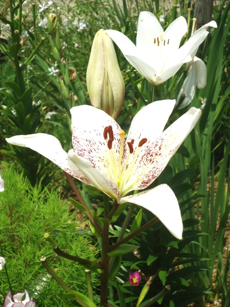 他の花の中に植えられている白に、斑もようが入ったユリです😀
