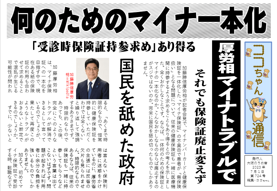 加藤勝信厚労相が記者会見で、マイナンバーカードと健康保険証を一体化した「マイナ保険証」の不具合で患者が「無保険扱い」となる問題について、従来の健康保険証も一緒に医療機関に持参するよう求めることもあり得るとの考えを示しました。全くおかしなことです。ならば、一体何のための保険証とマイナの一本化なのか。こんなおかしなものならば廃止するのがスジではないのか。完全に国民を舐め切ったものでしかありません。