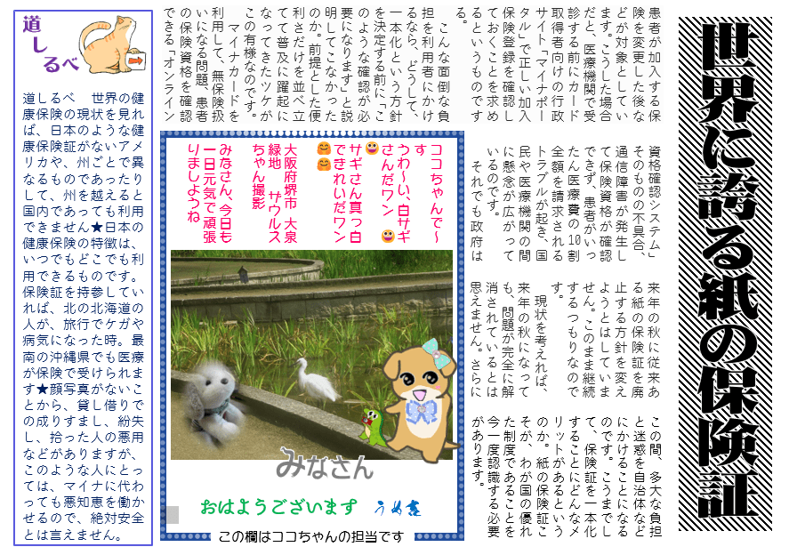 道しるべ 世界の健康保険の現状を見れば、日本のような健康保険証がないアメリカや、州ごとで異なるものであったりして、州を越えると国内であっても利用できません★日本の健康保険の特徴は、いつでもどこでも利用できるものです。保険証を持参していれば、北の北海道の人が、旅行でケガや病気になった時。最南の沖縄県でも医療が保険で受けられます★顔写真がないことから、貸し借りでの成りすまし、紛失し、拾った人の悪用などがありますが、このような人にとっては、マイナに代わっても悪知恵を働かせるので、絶対安全とは言えません。