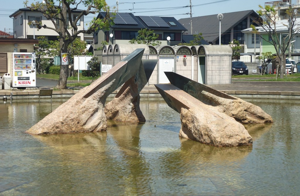 4つの赤御影石は、東西南北の基本方位を示し、噴水池を中心に四方へ向かって広がることを意味、鋳物師の全国への広がりを表現したものです😍