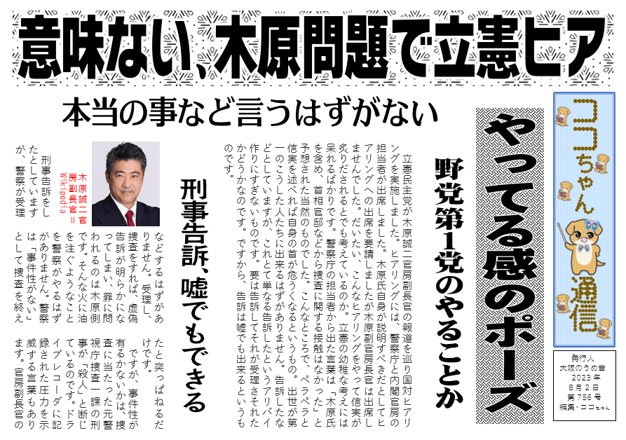 立憲民主党が木原誠二官房副長官の報道を巡り国対ヒアリングを実施しました。ヒアリングには、警察庁と内閣官房の担当者が出席しました。木原氏自身が説明すべきだとしてヒアリングへの出席を要請しましたが木原副官房長官は出席しませんでした。だいたい、こんなヒアリングをやって信実が炙りだされるとでも考えているのか。立憲の幼稚な考えには呆れるばかりです。警察庁の担当者から出た言葉は「木原氏を含め、首相官邸などから捜査に関する接触はなかった」と予想された当然のものでした。こんなところで、ペラペラと信実を述べれば自身の首が危うくなるというもの。出世が第一のこうした人たちに出来るはずがありません。告訴したなどとしていますが、これとて単なる告訴したというアリバイ作りにすぎないものです。要は告訴してそれが受理さそれたかどうかなのです。ですから、告訴は嘘でも出来るというものです。