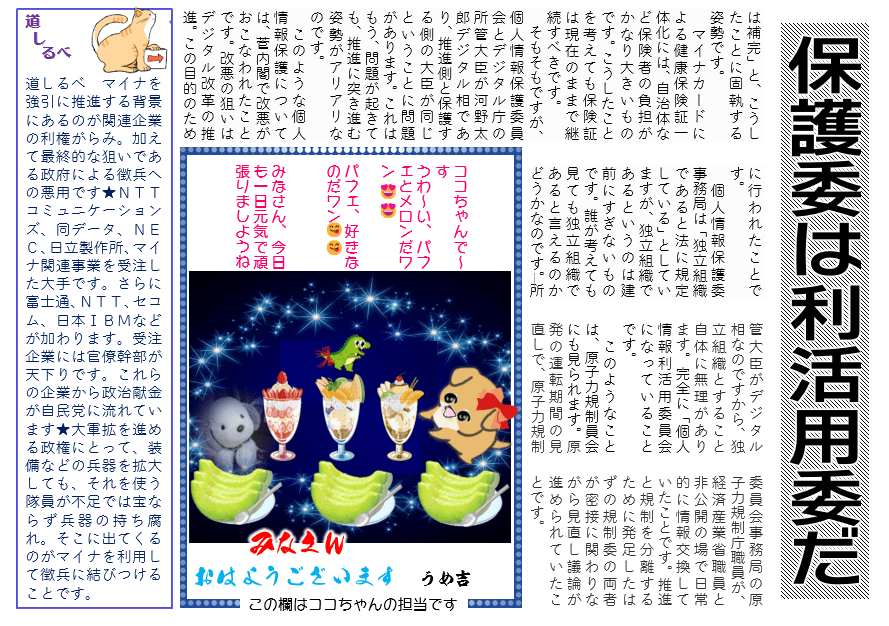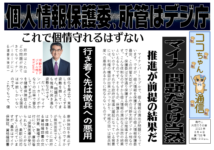 マイナンバートラブルで、個人情報の漏出が問題になっています。ですが、個人情報を保護するはずの個人情報保護委員会、この所管大臣がデジタル庁の河野太郎デジタル相なのです。保護委は文字通り保護する側、デジ庁は推進する側です。こんな体制なのですから個人情報の漏出など当然の結果といえるものです。そもそもが、保護されるしくみができていないのです。それでも政府が推進に躍起になっている背景には、利権の構図が出来上がっており、究極の狙いは徴兵制度への悪用があるからに他ならないものです。