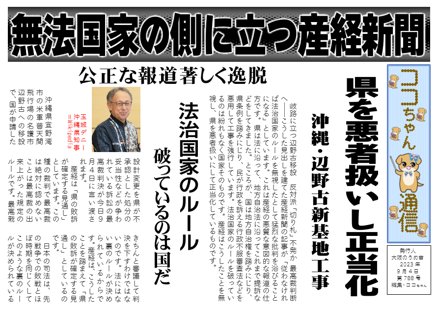 岐路に立つ辺野古移設 反対派「切り札」不発か 最高裁判断へ――こうした見出しを建てた産経新聞の記事が「従わなければ法治国家のルールを無視したとして猛烈な批判を浴びることになる」としています。これは産経の悪質な意図的な報道の仕方です。県は法に沿って、地方自治法に沿ってこれまで提訴などをしてきました。ところが、国は地方自治権を踏みにじり、県条例を踏みにじり、民が行政を訴える行政不服審査法などを悪用して工事を強行しています。法治国家のルールを破っているのは紛れもなく国家そのものです。産経はこうしたことを無視し、県を悪者扱いにして正当化しているものです。