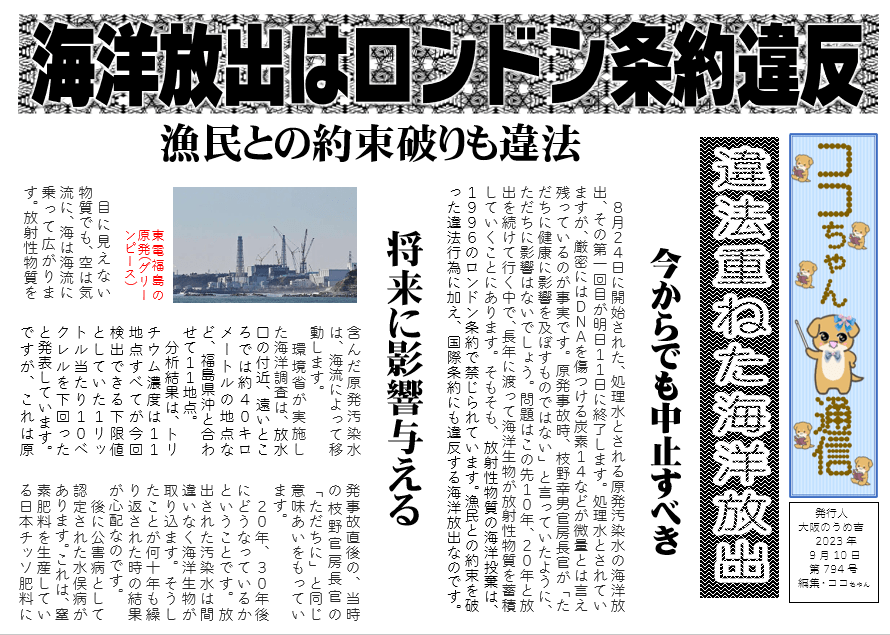 8月24日に開始された、処理水とされる原発汚染水の海洋放出、その第一回目が明日11日に終了します。処理水とされていますが、厳密にはDNAを傷つける炭素14などが微量とは言え残っているのが事実です。原発事故時、枝野幸男官房長官が「ただちに健康に影響を及ぼすものではない」と言っていたように、ただちに影響はないでしょう。問題はこの先10年、20年と放出を続けて行く中で、長年に渡って海洋生物が放射性物質を蓄積していくことにあります。そもそも、放射性物質の海洋投棄は、1996のロンドン条約で禁じられています。漁民との約束を破った違法行為に加え、国際条約にも違反する海洋放出なのです。
