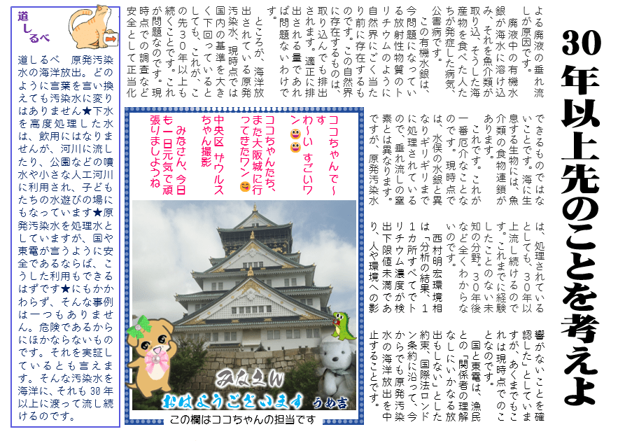 道しるべ 原発汚染水の海洋放出。どのように言葉を言い換えても汚染水に変りはありません★下水を高度処理した水は、飲用にはなりませんが、河川に流したり、公園などの噴水や小さな人工河川に利用され、子どもたちの水遊びの場にもなっています★原発汚染水を処理水としていますが、国や東電が言うように安全であるならば、こうした利用もできるはずです★にもかかわらず、そんな事例は一つもありません。危険であるからにほかならないものです。それを実証しているとも言えます。そんな汚染水を海洋に、それも30年以上に渡って流し続けるのです。