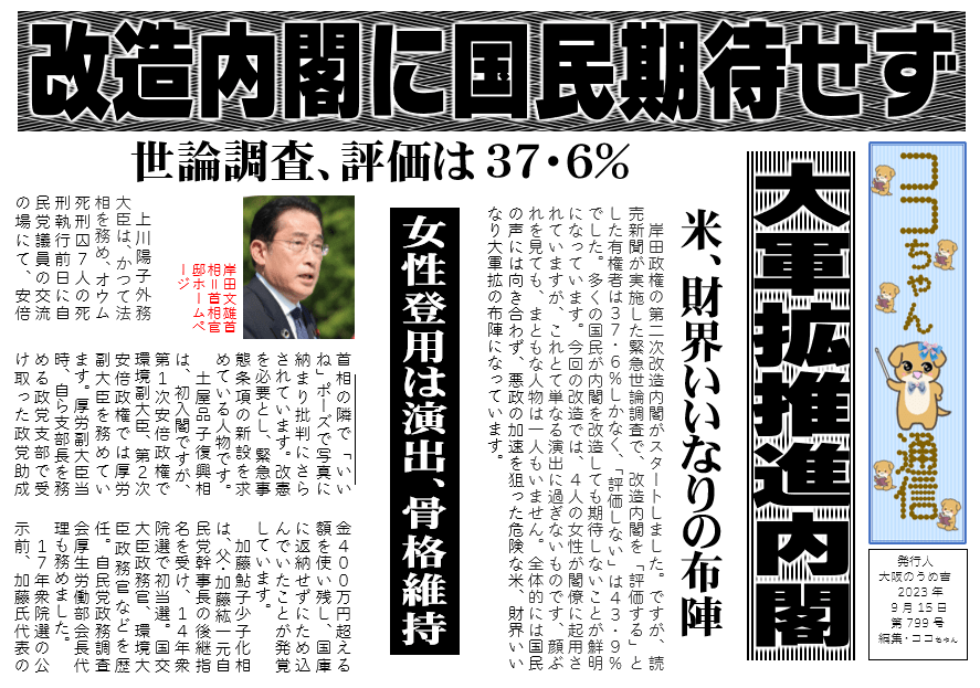 岸田政権の第二次改造内閣がスタートしました。ですが、読売新聞が実施した緊急世論調査で、改造内閣を「評価する」とした有権者は37・6%しかなく、「評価しない」は43・9%でした。多くの国民が内閣を改造しても期待しないことが鮮明になっています。今回の改造では、4人の女性が閣僚に起用されていますが、これとて単なる演出に過ぎないものです、顔ぶれを見ても、まともな人物は一人もいません。全体的には国民の声には向き合わず、悪政の加速を狙った危険な米、財界いいなり大軍拡の布陣になっています。