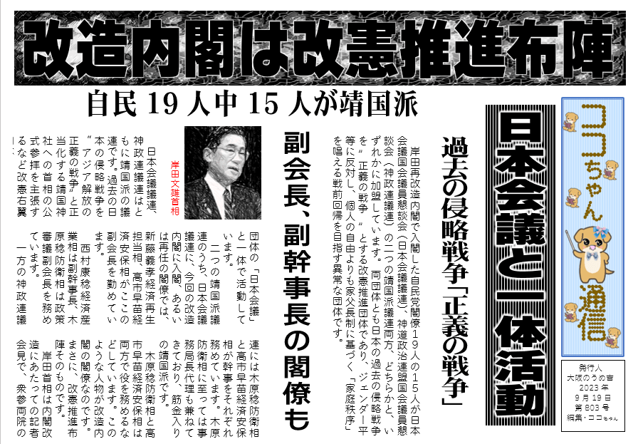 岸田再改造内閣で入閣した自民党閣僚19人の15人が日本会議国会議員懇談会(日本会議議連)、神道政治連盟国会議員懇談会(神政連議連)の二つの靖国派議連両方、どちらかと、いずれかに加盟しています。両団体とも日本の過去の侵略戦争を ”正義の戦争 ”とする改憲推進団体であり、ジェンダー平等に反対し、個人の自由よりも家父長制に基づく「家庭秩序」を唱える戦前回帰を目指す異常な団体です。