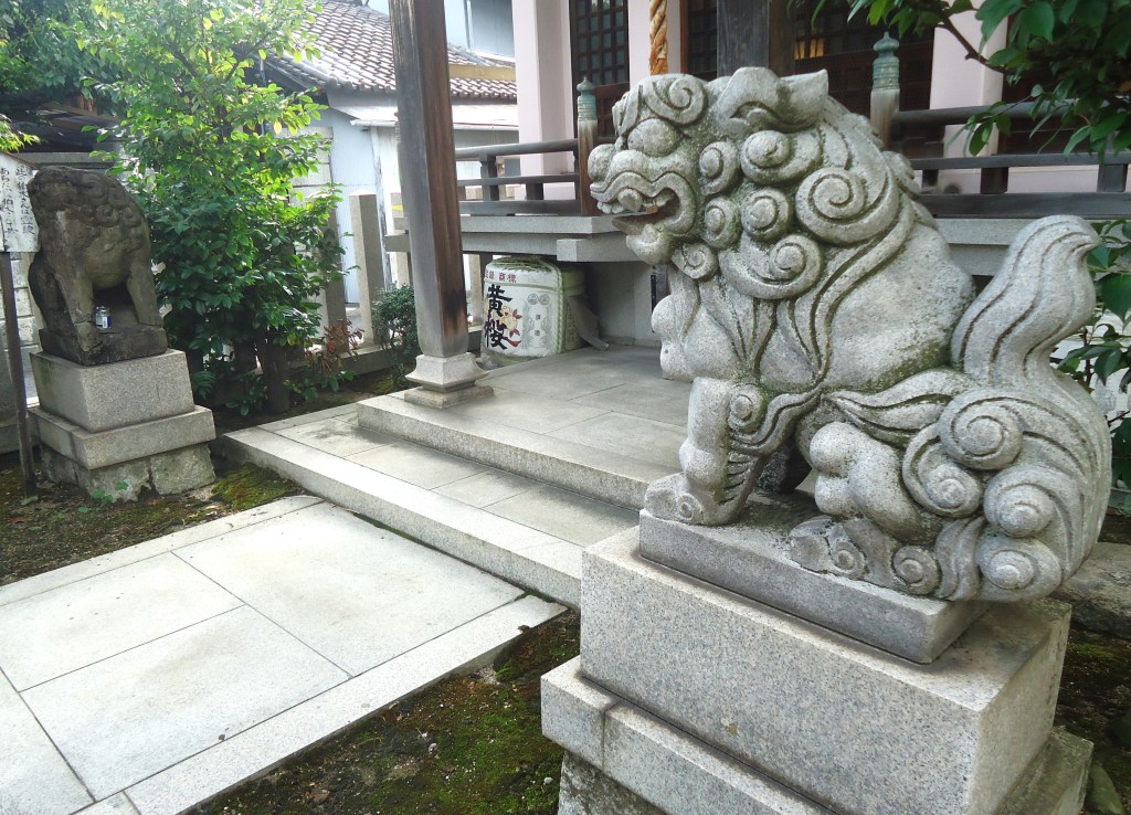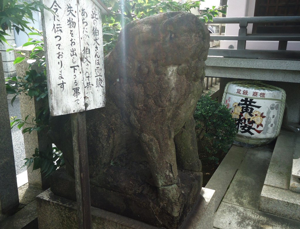 一方のコマさんは、頭の半分ほどがなくなっています(下の写真)が、江戸時代の浪速狛犬であることが推察できます。横の立て札には、失せ物発見の霊験があると書かれています。スタイルの差が大きいです😅