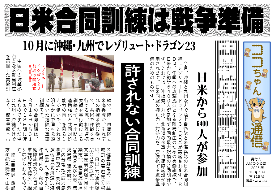今月、沖縄と九州などで陸上自衛隊と米海兵隊の日米合同訓練「レゾリュート・ドラゴン23」(RD)が実施されます。RDは、中国への攻撃拠点となる離島制圧のための実働訓練で、日米から総計6400人が参加する国内最大規模の合同訓練です。これには、沖縄県、九州、北海道の米軍・自衛隊施設が使用されます。日米同盟の抑止力・対処力を一層強化する戦争準備のためのものです。