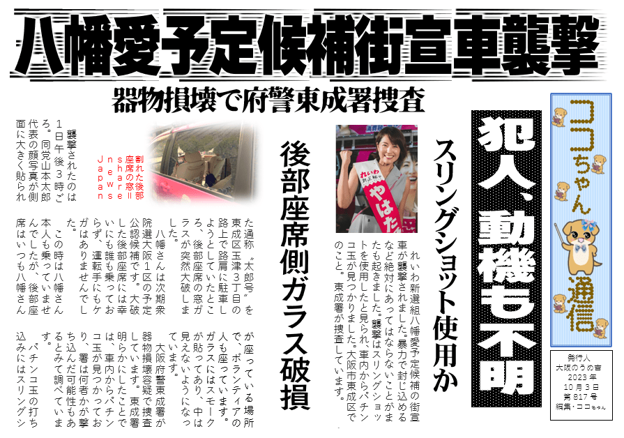 襲撃されたのは1日午後3時ごろ。同党山本太郎代表の顔写真が側面に大きく貼られた通称〝太郎号〟を東成区玉津3丁目の路上で路肩に駐車しようとしていたところ、後部座席の窓ガラスが突然大破しました。