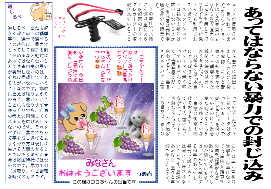 道しるべ またも起きた政治家への襲撃事件。選挙で選べるこの時代に、暴力でもってして相手を封じ込めるなど絶対にあってはならないことです★自身の思いが実現しないのは、それに同調してくれる人がいないということなのです。端的に言えば独りよがりの考え、思いということにもなります★ゆっくりでも、自身の考えに同調してくれる人を広げるしかないのです。それをせずに、暴力でもって事を成し遂げるようなやり方は現代に生きる人間のやることではありません★今は戦国時代ではないのです。暴力での〝城取り〟など野蛮な時代のものです。